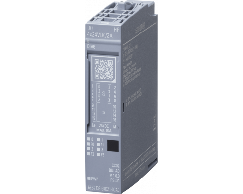 Модуль предназначен для использования с SIMATIC ET 200SP. Обеспечивает формирование 4 дискретных выхода с питанием 24 В DC и максимальным током 2 А. Использует схему PNP (источниковый выход). Встроенная функция диагностики каналов позволяет обнаруживать короткие замыкания и обрывы проводов, а также неисправности питания и каналов. Модуль имеет светодиодную индикацию неисправностей каналов. Подходит для типа BU A0. Имеет цветовую кодировку CC02.