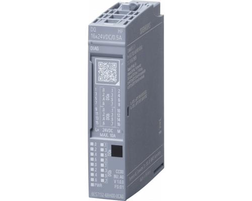 Модуль предназначен для использования с SIMATIC ET 200SP. Обеспечивает 16 каналов дискретного вывода 24 В DC/0.5 A. Тип вывода - источник PNP, с возможностью переключения на потенциал P. Предусмотрена диагностика каналов, включающая контроль короткого замыкания и обрыва цепи, а также контроль напряжения питания и неисправностей каналов. Индикация неисправностей осуществляется светодиодом. Подходит для базовых модулей типа A0.