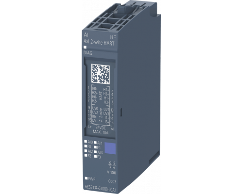 Модуль аналогового ввода поддерживает HART. Подключение – 2-проводное. Обеспечивается диагностика каналов. Разрядность составляет 16 бит. Точность составляет +/-0,3%. Предназначен для установки на базовые блоки типа A0, A1. Цветовой код – CC03. Поддерживает аналоговый ввод 4 канала типа I.
