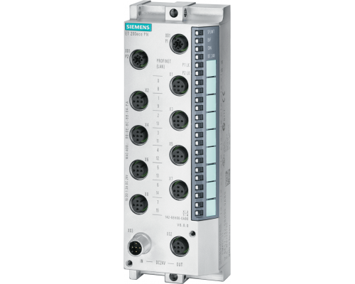 Станция распределённой периферии ET 200eco PN имеет 16 дискретных входов (DI) на 24В. Подключение осуществляется через 8 разъемов M12. Поддерживается двойная адресация. Обеспечивается степень защиты IP67.