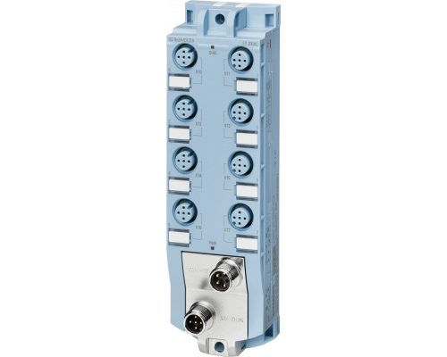 Модуль Simatic ET 200AL предназначен для подключения дискретных выходов. Он имеет 8 дискретных выходов с напряжением 24 В DC и током 2 А. Подключение осуществляется через разъемы 8xM12. Обеспечивается степень защиты IP67.