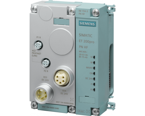 Модуль Simatic DP IM154-3 PN HF предназначен для использования с системой ET 200 PRO. Он обеспечивает подключение к сети Profinet и оснащен встроенным коммутатором. В комплекте поставляется терминальный модуль. Соединительный модуль 6ES7194-4AK00-0AA0 необходимо заказывать отдельно.
