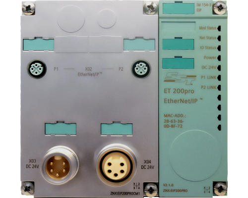 Модуль предназначен для головной сборки Ethernet/IP. Совместим с системой ET 200pro. Разъемы включают 2 x M12 и 2 x 7/8". Предусмотрены разъемы M12 и 7/8" для подключения.