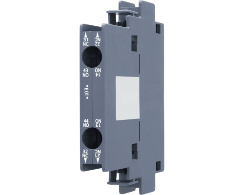 Вспомогательный контакт имеет конфигурацию 1 НО + 1 НЗ и расположен боково. Это контакт первого уровня. Размер составляет 10 мм и предназначен для контакторов размеров S0...S3. Подключение осуществляется через прижимную клемму.
