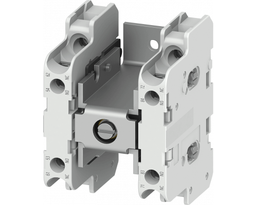 Блок дополнительных контактов имеет 2 нормально открытых и 2 нормально замкнутых контакта. Расположен справа. Предназначен для подключения дополнительных цепей управления и сигнализации.