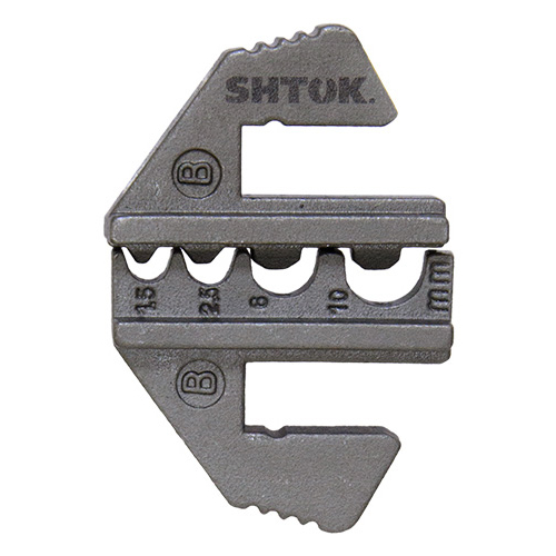 Фото. Матрица сменная Тип В SHTOK 03502-06 предназначена для пресс-клещей ПК-22БМ+. Применяется для опрессовки неизолированных наконечников и гильз. Диапазон сечений, кв.мм - 1.5/2.5/6.0/10.0. Профиль опрессовки - точка. Упаковка - блистер.
