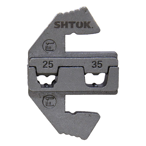 Фото. Матрица сменная Тип F1 SHTOK 03502-09 предназначена для пресс-клещей ПК-22БМ+. Применяется для опрессовки двойных неизолированных втулочных наконечников. Диапазон сечений, кв.мм - 25.0/35.0. Профиль опрессовки - клевер. Упаковка - блистер.