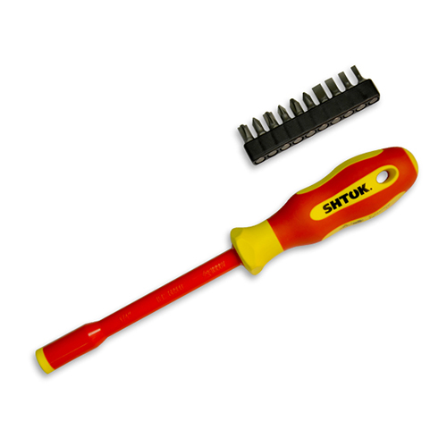 Диэлектрическая отвертка-битодержатель с набором бит 10+1 SHTOK 09340 изготовлена из материала с высокой твердостью (58-60 HRC), которая обеспечивает длительную работу. Рукоятка не скользит в ладони. Полностью изолированный стержень обеспечивает необходимую безопасность работы. Биты поставляются в отдельном холдере.