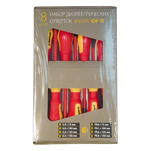 Набор диэлектрических отверток SHTOK 8 шт. картон 1000В 09905 состоит из диэлектрических отверток (четыре шлицевых и четыре крестовых). За счет наличия магнитного наконечника возможен монтаж в приборах, расположенных вертикально. Рабочая часть, выполненная из хром-молибден-ванадиевой стали, увеличивает прочность и износостойкость отверток. Набор поставляется в картонной упаковке.