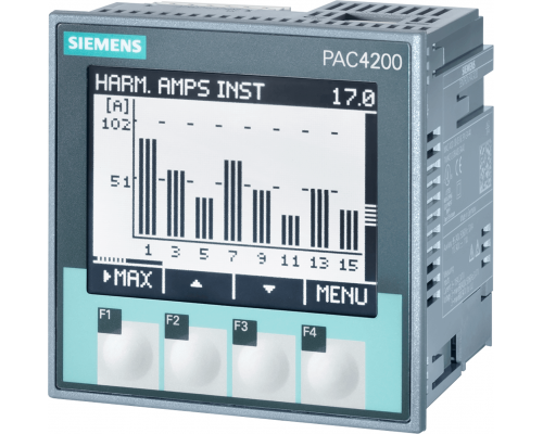 Многофункциональное измерительное устройство SENTRON PAC4200 оснащено ЖК дисплеем. Размер панели составляет 96x96 мм. Доступно напряжение питания 95…240 В АС и 110…340 В DC. Измерительные входы Ue имеют максимальное значение 3 AC 690/400 В. Предусмотрены измерительные входы Ie /1 A или /5 A. Устройство имеет клеммы для кабельных наконечников.
