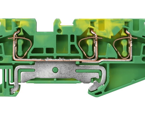 Клемма обеспечивает пружинное подсоединение. Доступное количество подключений – три. Диапазон сечения проводов составляет от 0.5 до 4 мм2. Ширина клеммы – 6.2 мм. Цвет изоляции – зелено-желтый.