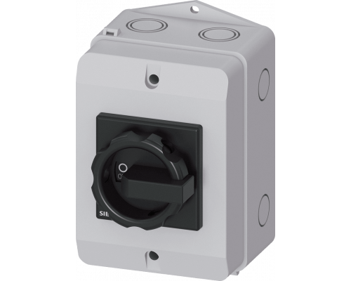 Выключатель предназначен для использования в цепях с номинальным напряжением 400 В и номинальным током 7,5 кВт. Имеет конструкцию 1НО+1НЗ и 1N-клемму, а также клемму 1PE. Корпус выполнен из пластика и имеет степень защиты IP65. Оснащен поворотной рукояткой черного цвета.