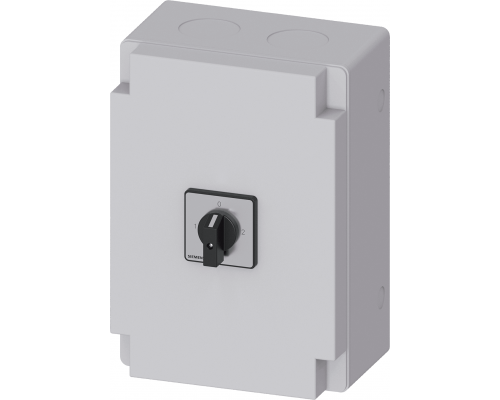 Переключатель имеет 3 полюса и рассчитан на ток iu=100. При напряжении 400V его мощность составляет 37 кВт. Имеет 2 нормально-открытые клеммы. Корпус изготовлен из изоляционного материала и обеспечивает степень защиты IP65. Это переключатель с положением 1-0-2 и не является запираемым.