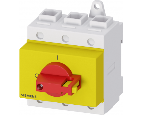 Аварийный главный управляющий переключатель имеет 3 полюса. Номинальный ток составляет iu=125. Мощность при напряжении 400В составляет 45 кВт. Предусмотрены варианты монтажа на монтажную рейку или посредством двух отверстий. Рычаг выполнен в красном и желтом цвете.