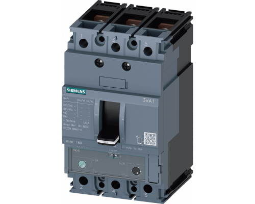 Выключатель расположен в литом корпусе. Типоразмер – 160. Класс отключающей способности – M. ICU составляет 55 кА при 415 В. Это трехполюсное устройство. Защита линии представлена TM240 и ATAM. Номинальный ток In равен 160 А. Защита от перегрузки имеет значения от 112 А до 160 А. Защита от тока короткого замыкания II составляет 5...10 x In. Присоединение – шинное.