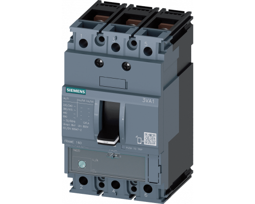 Выключатель выполнен в литом корпусе 3va1 iec типоразмера 160. Класс отключающей способности составляет M. Предохранительная характеристика ICU – 55kA при 415 В. Это трехполюсное устройство с защитой линии TM220, ATFM. Номинальный ток In равен 160A, а ток защиты от перегрузки – от 112A до 160A. Защита от тока короткого замыкания II составляет 10 x In. Присоединение осуществляется посредством шины.