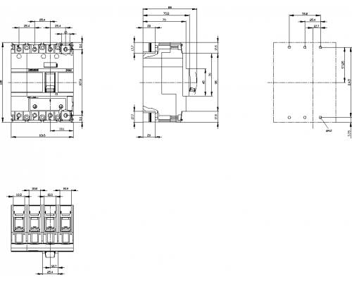 Выключатель расположен в литом корпусе. Типоразмер – 160. Класс отключения – M. Предельный ток короткого замыкания (ICU) составляет 55 кА при напряжении 415 В. Это четырехполюсное устройство. Защита линии представлена TM240, ATAM. Устройство имеет защиту от перегрузки (IR = 28A...40A) и защиту от тока короткого замыкания (II = 5...10 x IN). Обеспечивается защита нейтрали в 100% размере. Подключение осуществляется кабелем.