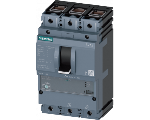 Продукт представляет собой выключатель в литом корпусе серии 3VA2 с IEC типоразмером 160 и классом отключения способностью M. Устройство имеет установочную технику и предназначено для использования в низковольтных энергосистемах зданий. Выключатель обладает индексом международной защиты ETU340 и защитой линии Elisa LI. Способен выдерживать номинальный ток в 100A и имеет защиту от перегрузки с током от 40A до 100A. Также обеспечивает защиту от тока короткого замыкания с коэффициентом 15 x In. Присоединение кабелей осуществляется устройством.