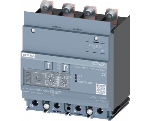 Защитное устройство является базовым дифф. током типа B или B+. Обеспечивается монтаж снизу. Расчетный дифф. ток составляет 0,03...5 А. Время срабатывания регулируемое, TV 0...10.000 мс. Устройство 4-полюсное. Входной ток – 160 А. Напряжение – 127-690 В. Принадлежит к серии 3VA1.