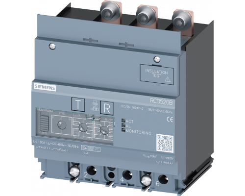 Защитное устройство представляет собой базовый дифф. ток типа B или B+. Обеспечивается монтаж снизу. Расчетный дифф. ток варьируется от 0,03 до ф5 А. Предусмотрена возможность регулировки времени срабатывания TV в диапазоне от 0 до 10000 мс. Устройство трехпозиционное. Входной ток составляет 160 А, входное напряжение – 127-690 В. Применяется как принадлежность для 3VA1.
