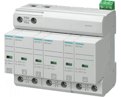Ограничитель перенапряжений предназначен для защиты систем TN-C. Устройство относится к типам 1 и т 2 согласно требованиям категории b+c. Номинальное напряжение составляет 350 В. Имеются в комплекте вставные блоки защиты 3-полюсного типа, 3+0. Оснащен дистанционным дисплеем.