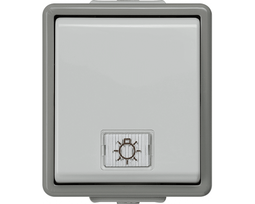 Выключатель предназначен для навесного монтажа. Обеспечивается защита IP44 от брызг. Устройство имеет контрольную лампу и одну клавишу. В комплекте два окна: прозрачное и с символом. Выключатель рассчитан на ток 10А и напряжение 250В.