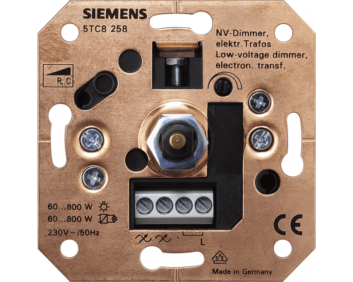 Диммер является нажимным типа R с функцией включения и выключения и индикаторной лампой. Работает от сети 230В с частотой 50-60 Гц и имеет максимальную мощность 1000 Вт. Конструкция включает электромеханическую часть и предназначен для монтажа под штукатурку. Обеспечивается крепление на лапках и винтовое крепление.