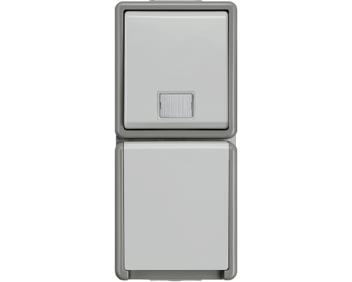 Представлена комбинация кнопки и розетки Schuko. Обеспечивается защита от прикосновения. Степень защиты IP44. Габаритные размеры изделия составляют 151x66x54 мм.