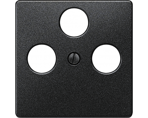 Крышка розетки выполнена в черном металлическом цвете. Размеры крышки составляют 55x55 мм. Предусмотрено три отверстия. Подходит для использования с розетками rf/tv/sat.