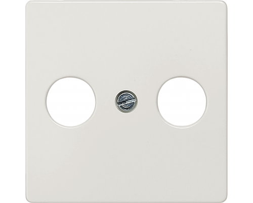 Крышка розетки выполнена в титаново-белом цвете. Габариты крышки составляют 55x55 мм. Предусмотрено два отверстия. Подходит для использования с розетками rf/tv/sat.