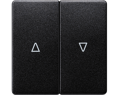 Выключатель предназначен для управления жалюзи. Имеет два клавишных элемента с символами "вверх/вниз". Размеры составляют 55x55 мм. Выключатель выполнен в черном металлическом цвете.