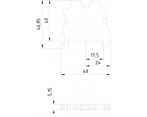 Клеммная колодка является проходной конструкции. Используются винтовые клеммы с размером 2,5 мм². Ширина клемм составляет 5,2 мм. Колодка имеет синий цвет.