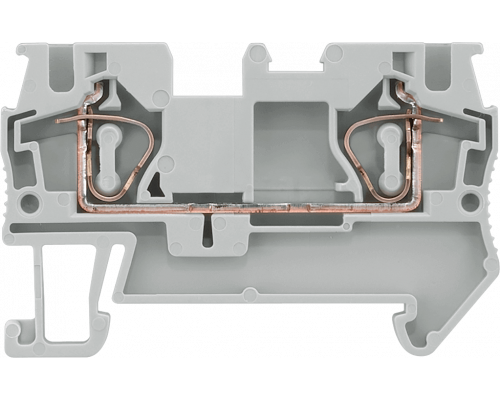 Клемма предназначена для проходного соединения проводов. Диапазон сечения подключаемых проводов составляет от 0.5 до 4 миллиметров квадратных. Ширина клеммы – 6.2 миллиметра. Корпус клеммы выполнен в сером цвере.