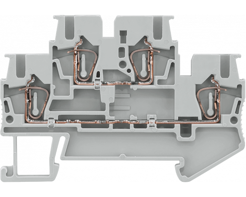 Клемма выполнена с двухрядным пружинным подсоединением. Поддерживает сечение провода от 0.08 до 2.5 мм². Ширина клеммы составляет 5.2 мм. Корпус клеммы имеет серый цвет.