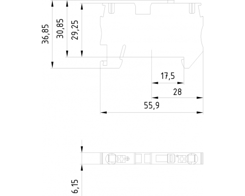 Клемма-разъединитель оснащена ножевыми контактами площадью 4 мм². Ширина устройства составляет 6,2 мм. Корпус выполнен в сером цвете.