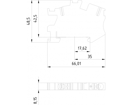 Клемма предназначена для соединения заземляющих проводников. Сечение провода, подключаемого к клемме, составляет 6 мм². Ширина клеммы – 8,2 мм. Цвет клеммы – зелено-желтый, соответствующий стандарту для заземляющих проводников.