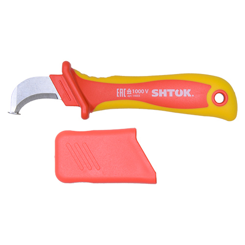 Нож для снятия изоляции с пяткой SHTOK 1000В VDE 14003 оснащен специальной рукояткой для надежного захвата. Можно применять данный нож для работ под напряжением. Инструмент не повреждает жилы во время снятия изоляции.