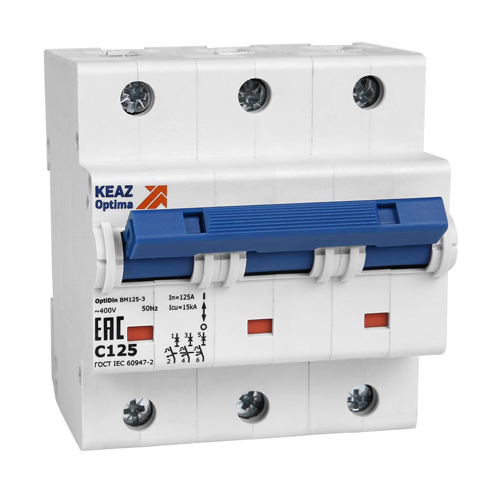 Модульный автоматический 3 полюсный выключатель переменного тока с предельной коммутационной способностью при переменном токе 20 кА на номинальный ток 100 А .