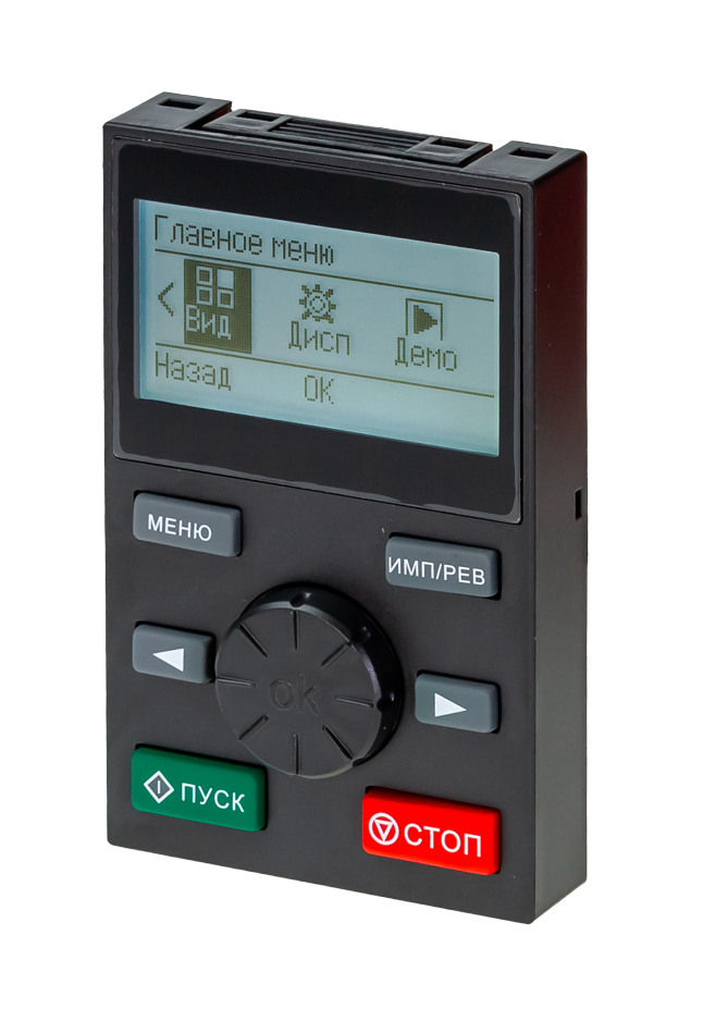 – пуска, остановки и удобного задания частоты при помощи встроенного поворотного энкодера;