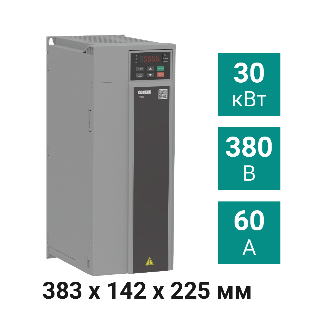 Преобразователь частоты ПЧВ3-30К-В [М01] предназначен для управления электродвигателями мощностью 30,0 кВт, используя трехфазный источник питания 380 В и обеспечивая выходной ток 60,0 А. Поддерживаются режимы управления U/f, векторное управление с/без обратной связи, а также интерфейсы RS-485 и опционально Ethernet, CAN. Преобразователь обладает перегрузочной способностью до 150% в течение 3 секунд и работает в диапазоне температур от -10 до +50 °C.