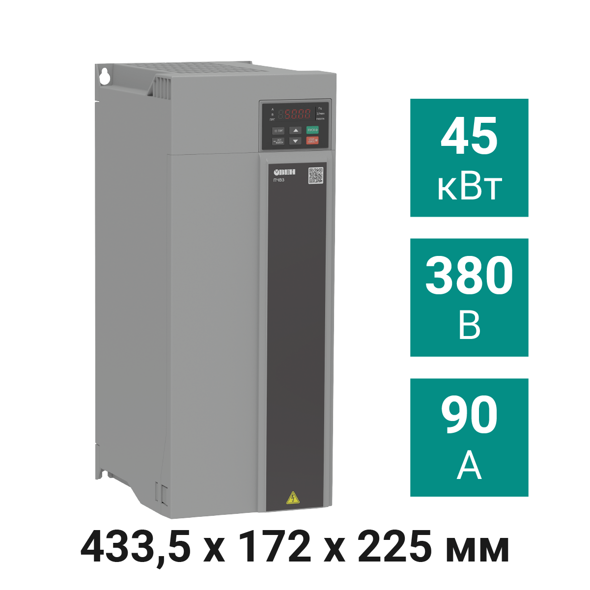 Преобразователь частоты ПЧВ3-45К-В [М01] предназначен для управления электродвигателями мощностью 45,0 кВт, имеет номинальный выходной ток 90,0 А и работает от трехфазного источника питания 380 В. Устройство поддерживает режимы управления U/f, векторное управление с/без обратной связи, а также оснащено интерфейсом RS-485 и опциональной поддержкой Ethernet, CAN, Modbus RTU, Modbus TCP, EtherCAT, CANopen, PROFINET, PROFIBUS. Габаритные размеры составляют 433,5х172х225 мм, диапазон рабочих температур – от -10 до +50 ºС.