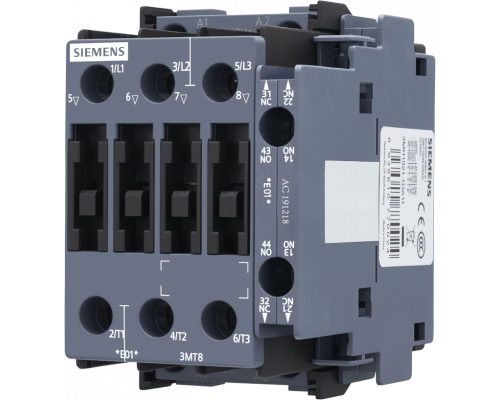 Контактор предназначен для коммутации цепей переменного тока. Номинальный ток составляет 32А, а номинальная мощность – 15кВт. Рабочее напряжение – 400В. Контактор имеет конфигурацию 1NO1NC. Управление осуществляется при помощи катушки напряжения 230В, частота – 50Гц. Размер корпуса – S0. Подключение осуществляется посредством клемм.