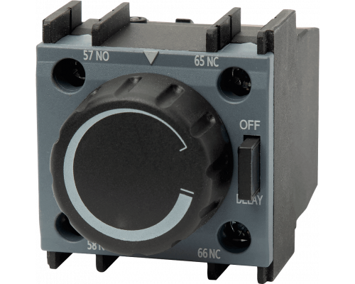 Реле времени представляет собой блок для контакторов 3RT6 размера S0. Обеспечивает задержку включения в диапазоне от 10 до 180 секунд. Имеет два переключающих контакта: 1 нормально открывающий (1NO) и 1 нормально закрывающий (1NC).