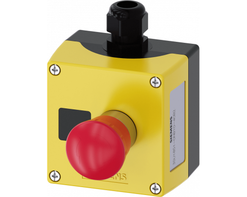 Корпус предназначен для командных устройств диаметром 22 мм. Материал корпуса – металл. Цвет верхней части корпуса – желтый. В комплекте один командный пункт, выполненный из металла, с углублением для шильдика. Предусмотрен грибковый аварийный выключатель диаметром 40 мм красного цвета с поворотной деблокировкой. Имеются контакты: один нормально замкнутый и один нормально разомкнутый. Подключение осуществляется на пружинных клеммах. Предусмотрен прямой ввод сверху/справа. В комплекте поставляется шильдик.