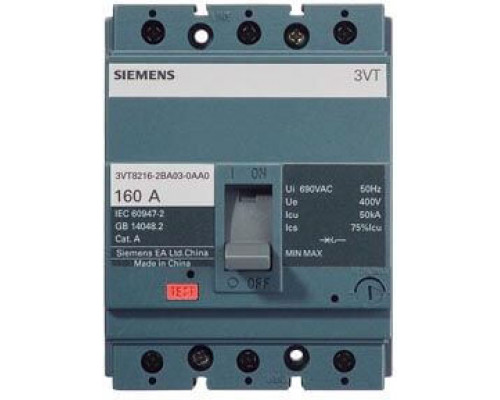Автоматический выключатель VT160 Standard имеет номинальную переключающую способность Icu 35 кА. Напряжение составляет 415/440 В AC. Это трехполюсное устройство предназначено для системной защиты. Используется тепломагнитный автоматический выключатель с номинальным током Ir 125 А и током Ii 1250 А. Защита от короткого замыкания осуществляется без вспомогательного реле. Также отсутствует вспомогательные переключатели. Устройство имеет фиксированное крепление.