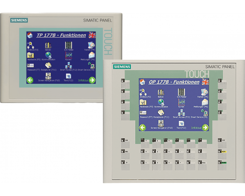 Панель оператора TP 177B DP оснащена STN-дисплеем диагональю 5.7 дюймов с градациями голубого цвета. Поддерживаются протоколы MPI и PROFIBUS-DP. Предусмотрены интерфейсы RS485, RS422 и USB. Дополнительно имеется интерфейс для принтера и разъем для карт MMC. Настраивается в среде WINCC Flexible «2005».