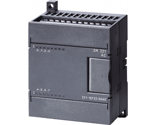 Модуль EM 221 предназначен для CPU 222, CPU 224, CPU 226 и CPU 226XM. Обеспечивается оптическое разделение внешних и внутренних цепей. Модуль имеет 8 входов для подключения сигналов ~120/230В.