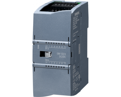 Модуль предназначен для использования с контроллерами SIMATIC S7-1200. Он имеет 8 дискретных входов и 8 дискретных выходов. Входы работают при 24 В и поддерживают схемы подключения Sink/Source. Выходы транзисторные, с максимальным током 0,5 А. Подключается к шине контроллера.