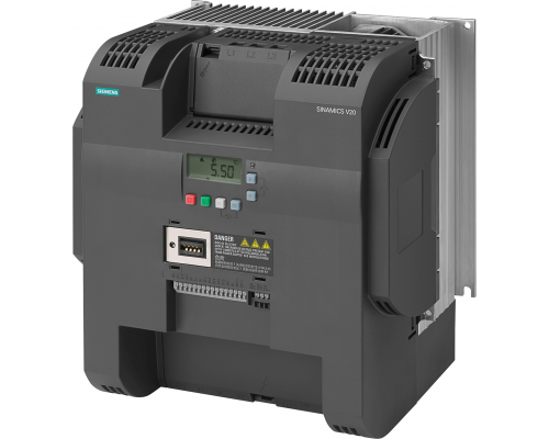 Преобразователь SINAMICS V20 работает от сети 380-480 В. Обеспечивается номинальная мощность 22 кВт с возможностью 150% перегрузки в течение 60 секунд. Возможна кратковременная перегрузка до 30 кВт при 110% перегрузке в течение 60 секунд. Устройство не имеет фильтра I/O интерфейса. Предусмотрены интерфейсы USS и Modbus. В числе интерфейсов: 4 дискретных входа, 2 дискретных выхода, 2 аналоговых входа и 1 аналоговый выход.