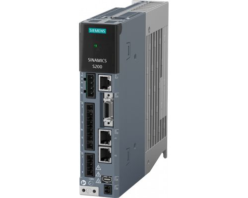 Преобразователь SINAMICS S200 с интерфейсом PROFINET. Входное напряжение составляет 200-240 В, 1/3 AC, с допустимым отклонением -15%/+10%. Потребляемый ток составляет 3.0/1.8A при частоте 50/60Hz. Выходное напряжение 0-inpu 2.4A, частота 0-550Hz. Подключен к двигателю мощностью 0.4 кВт. Степень защиты IP20. Габариты корпуса: 40x170x170 мм (ШxВxГ).